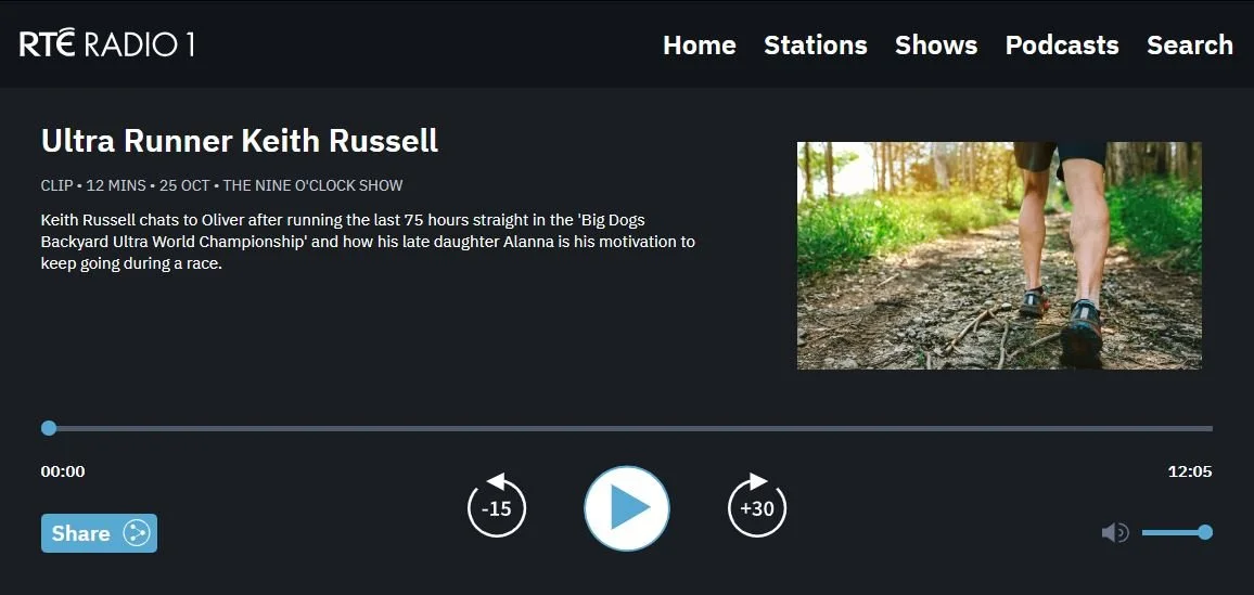 Keith chats to Oliver on RTE Radio 1 The Nine O’Clock Show after running for 75 hours straight in Big Dogs Backyard Ultra